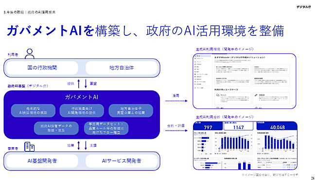 プロジェクトを主導するデジタル庁では、2025年5月よりAIの検証環境を構築して作業を進めており、AI活用ができる作業を実証中です。発表資料によると、2025年7月から開発に着手し、完成したアプリケーションは、2026年度から利用環境を中央官庁や地方自治体に広げていくとのことです。AIの基礎となるLLM (大規模言語モデル)に関しては、米OpenAIの「ChatGPT」や米Anthropicの「Claude」など、複数の海外製LLMを活用しており、今後は国産LLMの開発動向も見つつ、検討していく方針となっています。