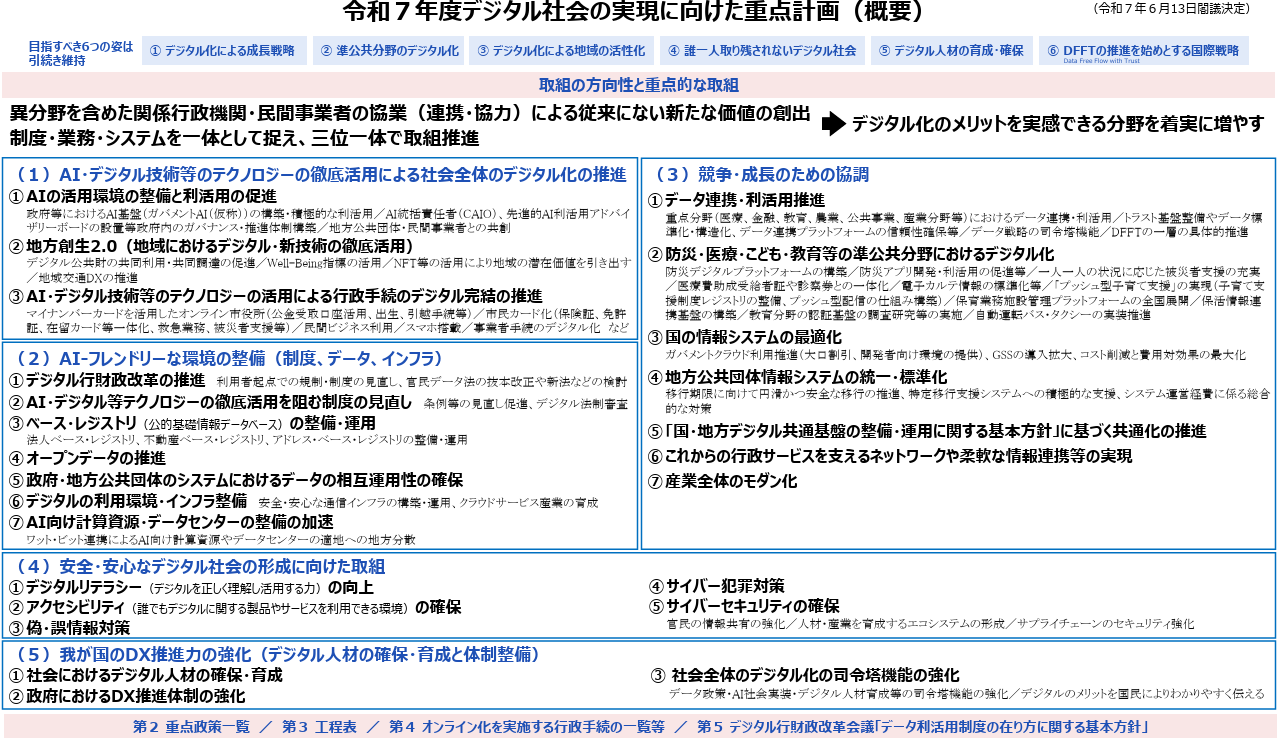 2025年6月13日、政府は「デジタル社会の実現に向けた重点計画」のなかで、さまざまな行政機関が横断的に利用できるAI基盤「ガバメントAI(仮称)」の開発を進めることを発表しました。
