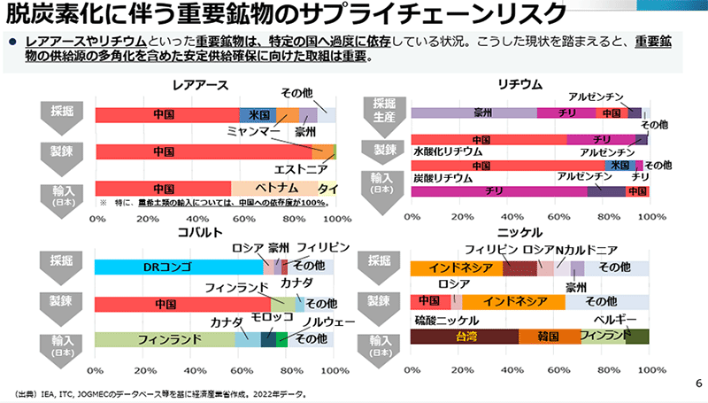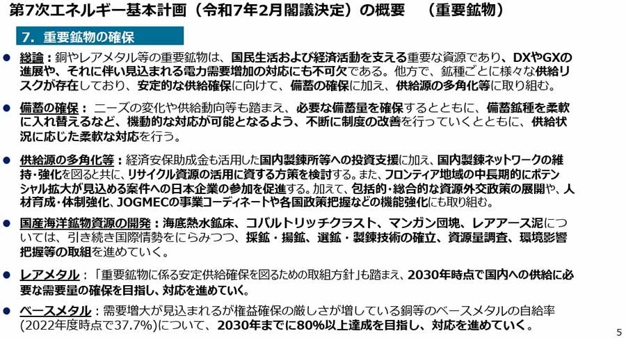 第7次エネルギー基本計画では「鉱物資源は工業製品の原材料として国民生活や経済活動を支える重要な資源であり、DXやGXの進展に伴う電力需要増加への対応に不可欠である。しかし埋蔵地の偏在や供給リスクが存在し、国内非鉄製錬所も厳しい状況にある。日本は海外権益確保や助成を行い、供給途絶に備えた備蓄や供給源の多角化を進めていく。今後は経済安全保障と産業政策の観点から、サプライチェーンリスクの分析を踏まえた総合的な対応を進めていく」としています。