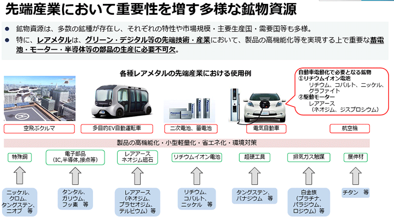 日本は資源の多くを輸入に依存しており、資源の価格高騰や供給停止は、製造業だけではなくあらゆる産業に大きな影響を与えます。特に電動車、電子機器、電池などの分野では、レアメタルやリチウムなどの安定供給が不可欠です。