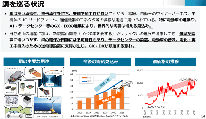 またレアアース以外にも、近年では銅の動向にも注目が集まっています。電線、自動車のワイヤーハーネス、半導体の IC リードフレーム、通信機器のコネクタ等の多様な用途に用いられますが、EV、AI、データセンターなどの進展により、世界的な需要は増加する見込みとなっています。